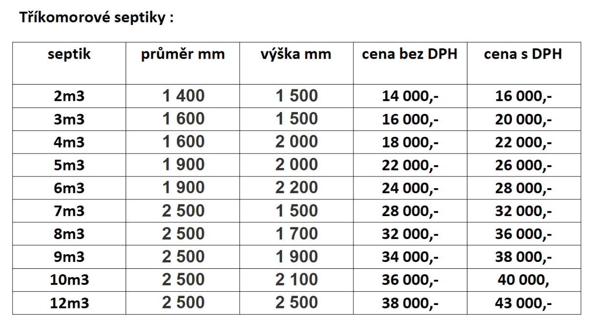V naší nabídce najdete válcové septiky o objemu od 2m3 do 12m3. Pokud Vám nevyhovují nabízené rozměry, jsme schopni po dohodě vyrobit septik o různých průměrech a výškách.